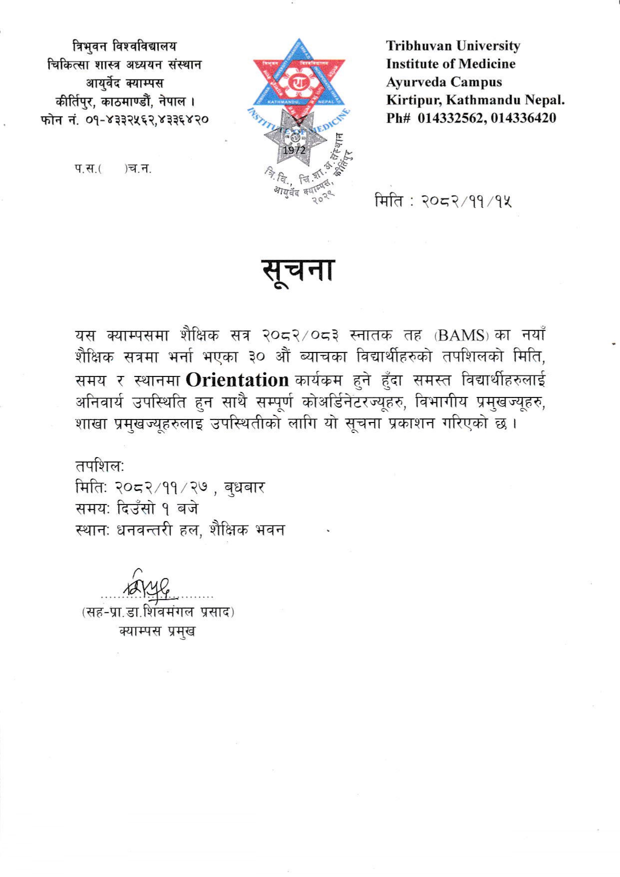 यस क्याम्पसमा शैक्षिक सत्र २०८२/०८३ स्नातक तह (BAMS) का नयाँ शैक्षिक सत्रमा भर्ना भएका ३० औं ब्याचका विद्यार्थीहरुको तपशिलको मिति, समय र स्थानमा Orientation कार्यकम हुने हुँदा समस्त विद्यार्थीहरुलाई अनिवार्य उपस्थिति हुन साथै सम्पूर्ण कोअर्डिनेटरज्यूहरु, विभागीय प्रमुखज्यूहरु, शाखा प्रमुखज्यूहरुलाइ उपस्थितीको लागि यो सूचना प्रकाशन गरिएको छ ।