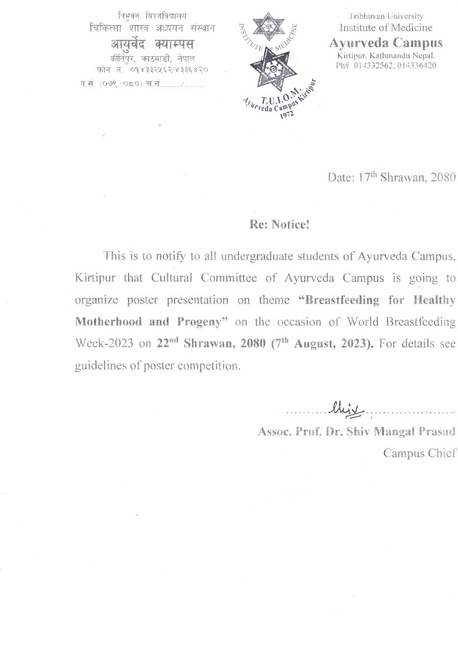 Poster Presentation competition on theme "Breastfeeding for Healthy Motherhood and Progeny" On the occasion of Word Breastfeeding Week on 22nd shrawan,2080. For more details see guidelines of poster competition.
