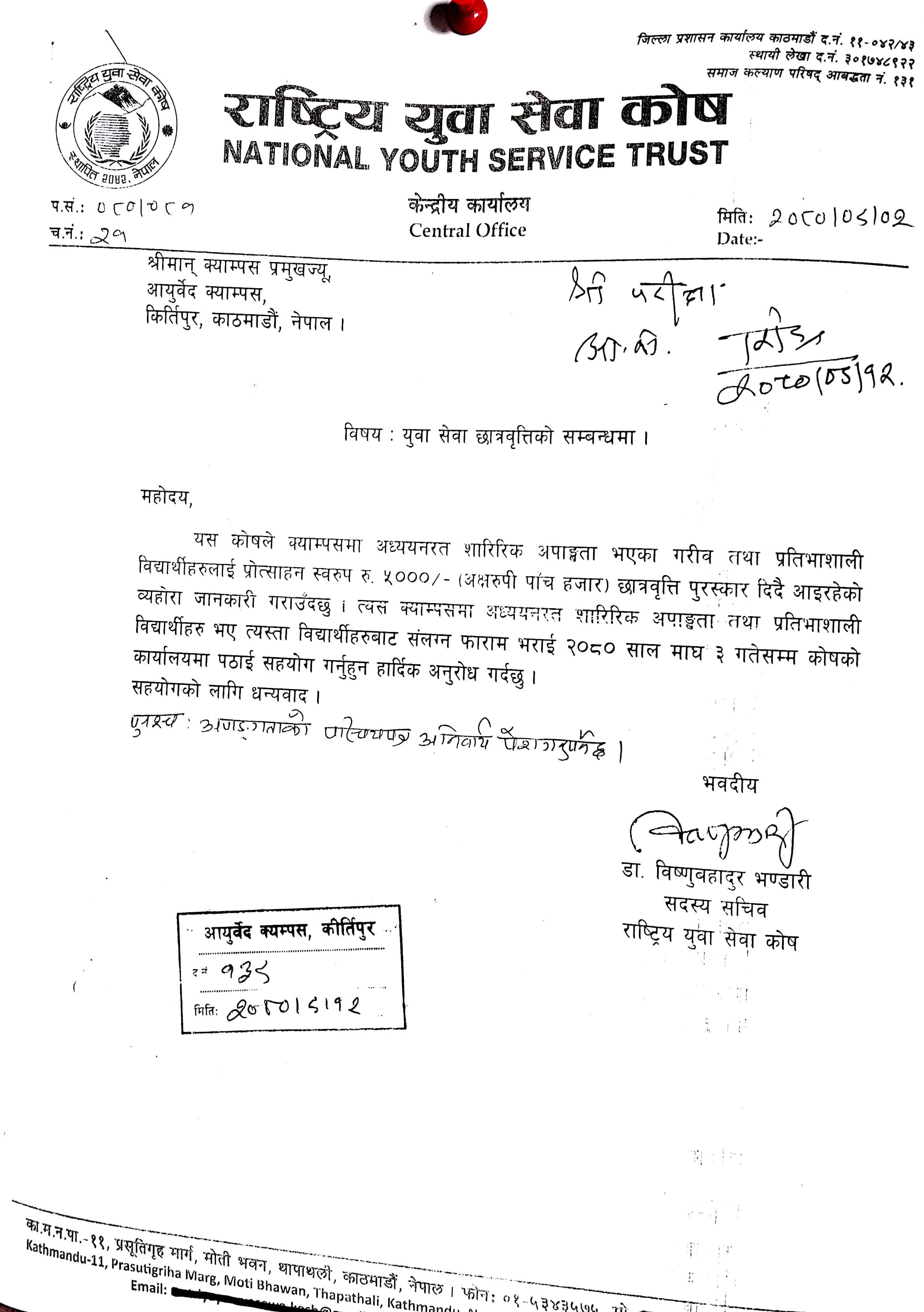 राष्टिय युवा सेवा कोष दारा छात्रवृति सम्बन्धमा