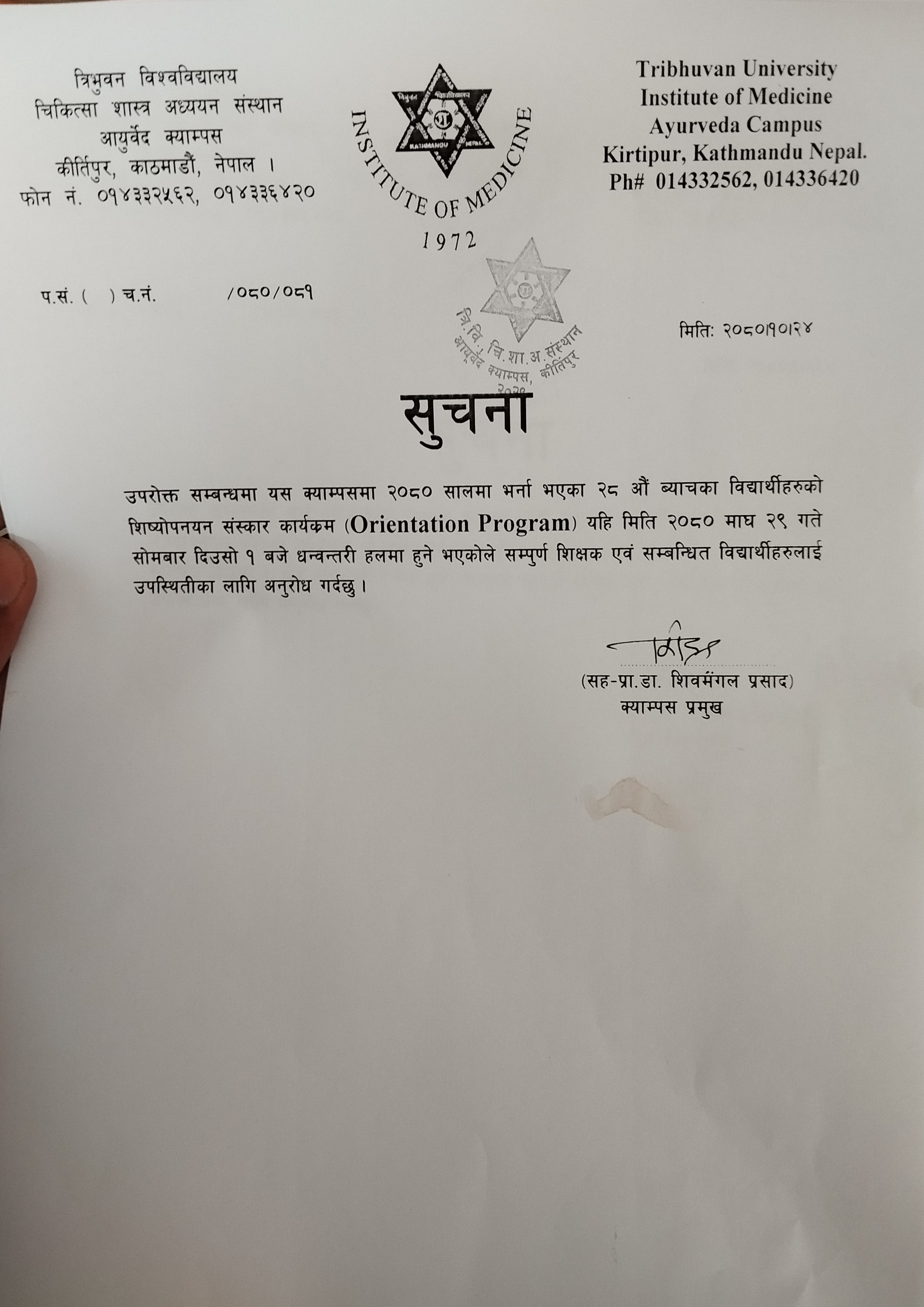 उपरोक्त सम्बन्धमा यस क्याम्पसमा २०८० सालमा भर्ना भएका २८ औं ब्याचका विद्यार्थीहरुको शिष्योपनयन संस्कार कार्यकम (Orientation Program) यहि मिति २०८० माघ २९ गते सोमबार दिउसो १ बजे धन्वन्तरी हलमा हुने भएकोले सम्पुर्ण शिक्षक एवं सम्बन्धित विद्यार्थीहरुलाई उपस्थितीका लागि अनुरोध गर्दछु ।